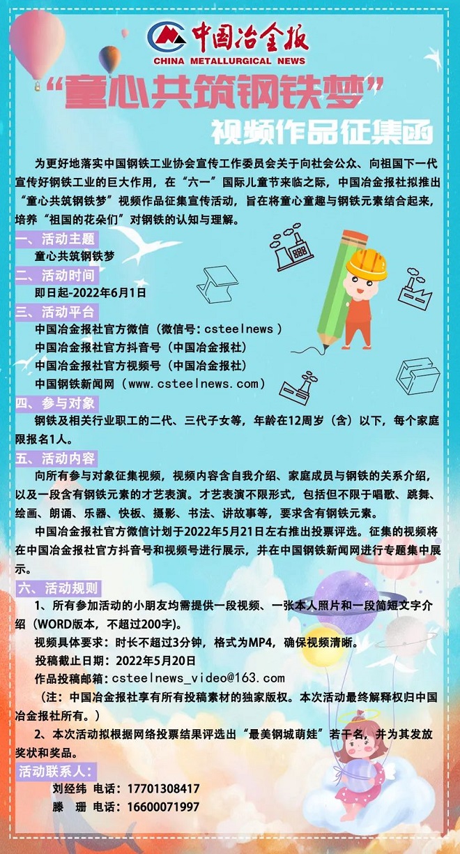 為更好地落實中國鋼鐵工業協會宣傳工作委員會關於向社會公眾、向祖國下一代宣傳好鋼鐵工業的巨大作用的指示,在“六一”國際兒童節來臨之際,中國冶金報社擬推出“童心共築鋼鐵夢”視頻作品征集宣傳活動,旨在將童心童趣與鋼鐵元素結合起來,培養“祖國的花朵們”對鋼鐵的認知與理解。
