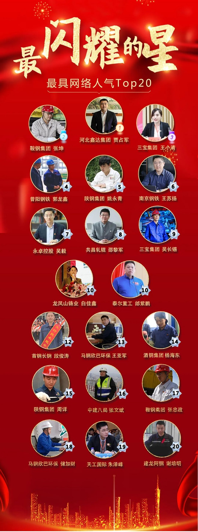 經過一代代青年的接力奮鬥,中國從缺鐵少鋼一步步發展成為世界品種最全、產量最大的鋼鐵強國。今天是五四青年節,明天是中國共青團成立100周年。為展現鋼鐵及相關行業勇挑重擔、敢於衝鋒、善於創新的有為青年風采,也為激勵青年向先進學習、向優秀靠齊,中國冶金報社聯合全國鋼鐵行業共青團工作指導和推進委員會舉辦第二屆“最閃耀的星”五四青年網絡投票暨“鋼鐵行業元宇宙菁英大會”。現將第二屆“最閃耀的星”五四青年網絡投票結果予以公布(按投票結果排序)。