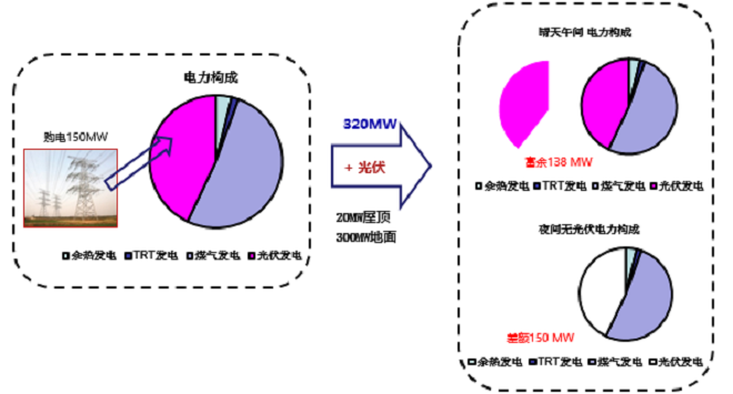 鋼(gang)鐵(tie)行(xing)業(ye)可(ke)發(fa)展(zhan)的(de)可(ke)再(zai)生(sheng)能(neng)源(yuan)有(you)光(guang)伏(fu)發(fa)電(dian)和(he)風(feng)力(li)發(fa)電(dian),鋼(gang)鐵(tie)企(qi)業(ye)大(da)麵(mian)積(ji)的(de)廠(chang)房(fang)具(ju)有(you)發(fa)展(zhan)屋(wu)頂(ding)光(guang)伏(fu)發(fa)電(dian)的(de)天(tian)然(ran)優(you)勢(shi),臨(lin)江(jiang)靠(kao)海(hai)的(de)鋼(gang)鐵(tie)企(qi)業(ye)具(ju)有(you)發(fa)展(zhan)風(feng)力(li)發(fa)電(dian)的(de)資(zi)源(yuan)條(tiao)件(jian)。可(ke)再(zai)生(sheng)能(neng)源(yuan)有(you)間(jian)斷(duan)不(bu)穩(wen)定(ding)的(de)先(xian)天(tian)不(bu)足(zu),較(jiao)難(nan)實(shi)現(xian)連(lian)續(xu)穩(wen)定(ding)供(gong)能(neng)的(de)要(yao)求(qiu),而(er)鋼(gang)鐵(tie)企(qi)業(ye)有(you)豐(feng)富(fu)的(de)二(er)次(ci)能(neng)源(yuan),能(neng)夠(gou)與(yu)可(ke)再(zai)生(sheng)能(neng)源(yuan)形(xing)成(cheng)良(liang)性(xing)互(hu)補(bu)。因(yin)此(ci),如(ru)何(he)實(shi)現(xian)新(xin)能(neng)源(yuan)消(xiao)納(na)成(cheng)為(wei)鋼(gang)鐵(tie)能(neng)源(yuan)轉(zhuan)型(xing)的(de)關(guan)鍵(jian)環(huan)節(jie)。鋼(gang)鐵(tie)企(qi)業(ye)在(zai)引(yin)入(ru)新(xin)能(neng)源(yuan)發(fa)電(dian)後(hou),會(hui)給(gei)企(qi)業(ye)用(yong)能(neng)安(an)全(quan)性(xing)和(he)用(yong)能(neng)經(jing)濟(ji)性(xing)帶(dai)來(lai)一(yi)定(ding)的(de)影(ying)響(xiang)。首(shou)先(xian),引(yin)入(ru)新(xin)能(neng)源(yuan)發(fa)電(dian)對(dui)鋼(gang)鐵(tie)企(qi)業(ye)原(yuan)有(you)電(dian)力(li)利(li)用(yong)、餘熱餘能發電均形成影響,引起電網關口電量的大幅波動;其(qi)次(ci),新(xin)能(neng)源(yuan)發(fa)電(dian)的(de)大(da)容(rong)量(liang)接(jie)入(ru),企(qi)業(ye)自(zi)發(fa)電(dian)比(bi)例(li)提(ti)高(gao),午(wu)間(jian)將(jiang)富(fu)餘(yu)電(dian)量(liang)以(yi)低(di)價(jia)上(shang)網(wang),晚(wan)高(gao)峰(feng)以(yi)峰(feng)價(jia)從(cong)電(dian)網(wang)購(gou)電(dian),效(xiao)益(yi)受(shou)到(dao)影(ying)響(xiang)。某(mou)鋼(gang)鐵(tie)企(qi)業(ye)引(yin)入(ru)新(xin)能(neng)源(yuan)發(fa)電(dian)對(dui)現(xian)有(you)係(xi)統(tong)的(de)影(ying)響(xiang)見(jian)圖(tu)2。企業自發電200MW,其中煤氣發電180MW(2台100MW)、餘熱發電13.4MW,TRT發電5.9MW,不足部分約150MW由電網購入;引入300MW地麵光伏及20MW屋頂光伏後,晴天正午最大富餘功率約138MW,晚間差額約150MW。