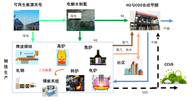 在(zai)未(wei)來(lai)建(jian)設(she)以(yi)新(xin)能(neng)源(yuan)為(wei)主(zhu)體(ti)的(de)新(xin)型(xing)電(dian)力(li)係(xi)統(tong)背(bei)景(jing)下(xia),鋼(gang)鐵(tie)行(xing)業(ye)能(neng)源(yuan)係(xi)統(tong)應(ying)以(yi)電(dian)能(neng)替(ti)代(dai)和(he)氫(qing)能(neng)替(ti)代(dai)為(wei)主(zhu)線(xian),綠(lv)電(dian)和(he)綠(lv)氫(qing)的(de)組(zu)合(he)可(ke)以(yi)通(tong)用(yong)在(zai)鋼(gang)鐵(tie)生(sheng)產(chan)的(de)各(ge)個(ge)環(huan)節(jie)。因(yin)此(ci),構(gou)建(jian)以(yi)“綠電+綠氫”為wei核he心xin的de能neng源yuan係xi統tong,以yi甲jia醇chun作zuo為wei優you質zhi載zai體ti,加jia上shang氫qing冶ye金jin技ji術shu的de創chuang新xin與yu應ying用yong,使shi鋼gang鐵tie擺bai脫tuo對dui化hua石shi能neng源yuan的de依yi賴lai,從cong源yuan頭tou上shang解jie決jue碳tan排pai放fang問wen題ti,是shi實shi現xian低di碳tan甚shen至zhi“零碳”排放的最佳途徑。同時依靠“互聯網+”加快能源數字化、智能化升級,提高能源係統靈活感知及高效運行能力,最終實現能源係統聯通共享。