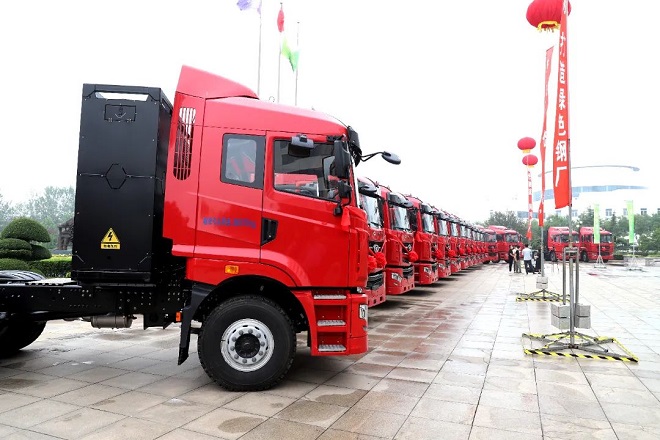 目前,德龍鋼鐵、新天鋼集團已采購新能源運輸車輛201輛,包括5輛新投運的氫能重卡、196輛純電重卡,用於疏港運輸與場內貨物短倒,每年可減少運輸環節二氧化碳排放15309噸,助力城市綠色發展。
