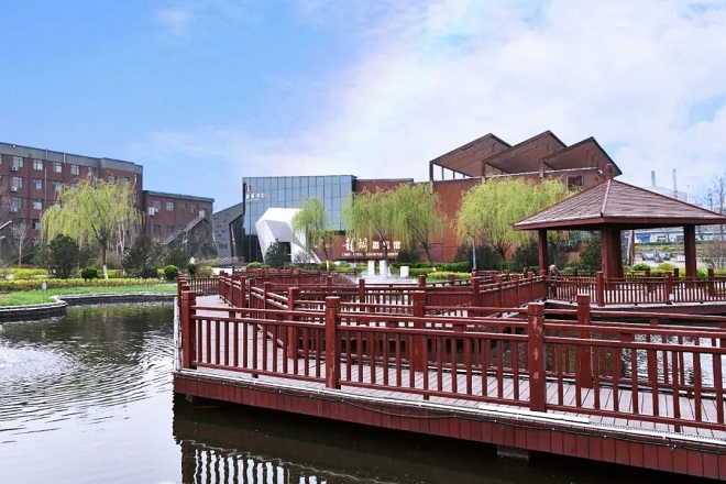 圖為陝鋼龍鋼公司展覽館前人工湖、涼亭棧道 徐顥軒攝