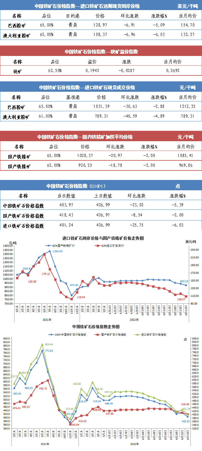 【行業指數】6月22日中國鐵礦石價格指數