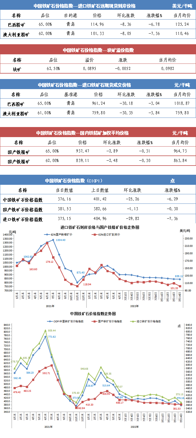 【行業指數】7月14日中國鐵礦石價格指數
