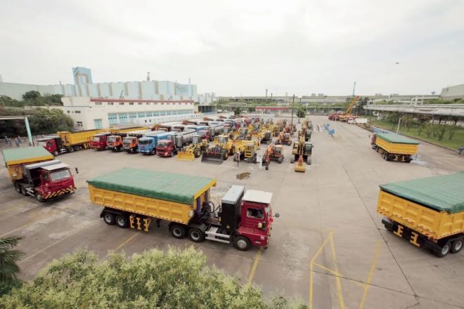 圖為中冶寶鋼191台套涉及32種規格型號的工程機械和運輸車輛在寶鋼股份寶山基地有序投入使用。