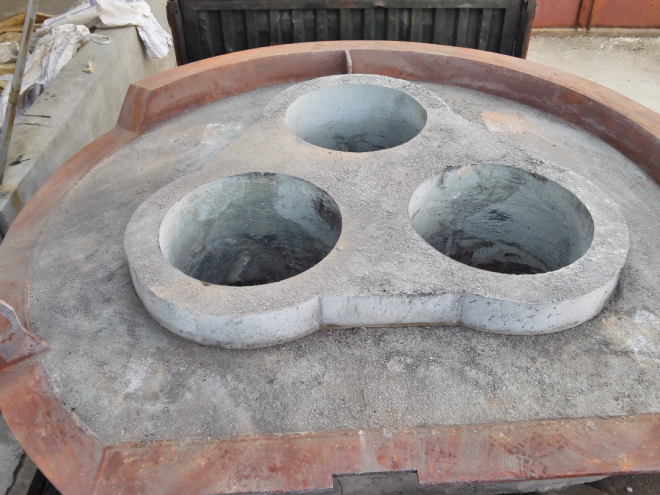 三(san)角(jiao)區(qu)是(shi)爐(lu)頂(ding)的(de)關(guan)鍵(jian)部(bu)位(wei),工(gong)作(zuo)環(huan)境(jing)最(zui)為(wei)惡(e)劣(lie),必(bi)須(xu)要(yao)保(bao)證(zheng)材(cai)料(liao)有(you)較(jiao)高(gao)的(de)純(chun)度(du),所(suo)以(yi)要(yao)求(qiu)此(ci)件(jian)需(xu)要(yao)單(dan)獨(du)提(ti)前(qian)預(yu)製(zhi)。待(dai)成(cheng)型(xing)養(yang)護(hu)到(dao)期(qi)後(hou)脫(tuo)模(mo),等(deng)預(yu)製(zhi)件(jian)獲(huo)得(de)足(zu)夠(gou)的(de)強(qiang)度(du)後(hou)再(zai)在(zai)其(qi)周(zhou)圍(wei)澆(jiao)注(zhu)外(wai)圍(wei)部(bu)分(fen);外(wai)圍(wei)部(bu)分(fen)根(gen)據(ju)使(shi)用(yong)環(huan)境(jing)和(he)易(yi)損(sun)程(cheng)度(du)又(you)分(fen)為(wei)外(wai)圍(wei)下(xia)部(bu)和(he)外(wai)圍(wei)上(shang)部(bu)兩(liang)個(ge)部(bu)分(fen),外(wai)圍(wei)下(xia)部(bu)是(shi)熱(re)麵(mian),接(jie)近(jin)鋼(gang)液(ye)麵(mian),材(cai)料(liao)檔(dang)次(ci)僅(jin)次(ci)於(yu)中(zhong)心(xin)三(san)角(jiao)區(qu),外(wai)圍(wei)上(shang)部(bu)相(xiang)對(dui)而(er)言(yan)為(wei)冷(leng)麵(mian),使(shi)用(yong)環(huan)境(jing)基(ji)本(ben)無(wu)異(yi)常(chang)。