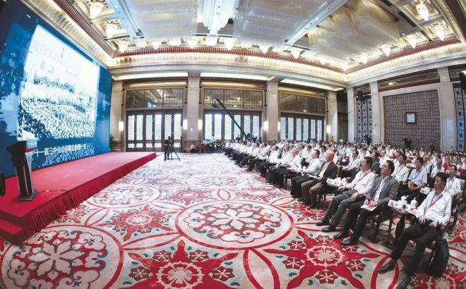 圖為2019年9月7日,在鋼鐵行業慶祝中華人民共和國成立70周年座談會上,與會嘉賓觀看由中國冶金報社製作的首部鋼鐵行業宣傳片《中國鋼鐵讓世界更美好》。(曹海艇 攝)