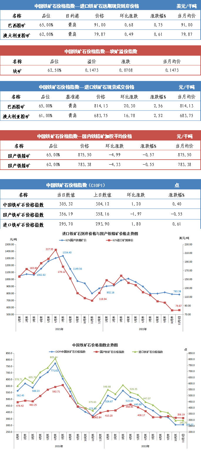 【行業指數】11月1日中國鐵礦石價格指數