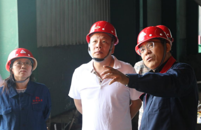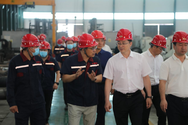 圖為朝陽聯強軋輥有限公司董事長張正(中)在孫建勳總經理(右)陪同下在公司車間調研。