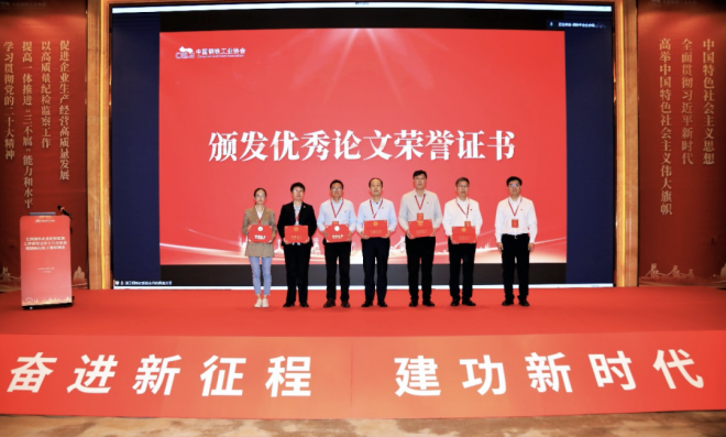 年會還對征集的論文進行了表彰,共評選出一等獎5篇、二等獎15篇、三等獎50篇、優秀獎37篇,會上發布了研究會與冶金工業出版社合作出版發行的《全國鋼鐵企業紀檢監察係統慶祝黨的二十大勝利召開優秀論文選編——鋼鐵衛士》,並為優秀論文頒發了榮譽證書。隨後,鞍鋼集團紀委書記申長純、首鋼股份紀委書記關鍇、山鋼集團紀委綜合部副部長劉烈濤代表一等獎論文作者分別進行了各自論文的發布。
