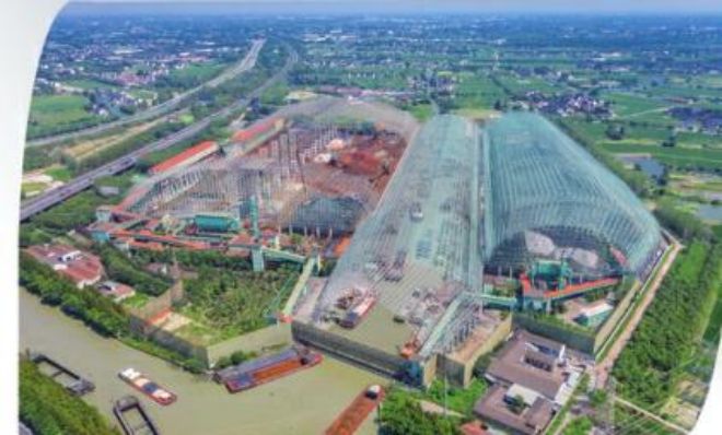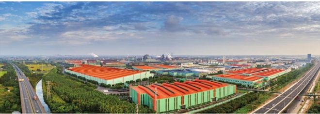 在從常熟市市區通往長江的高架橋途中,可以看到一大片牆體為綠色的廠房;聳立在廠區中間的高大煙囪以蔚藍色打底,上麵繪著潔白的雲朵;在廠房與廠房之間的空隙處,間或有樹冠探出屋麵;在秋季明媚的陽光下,橘紅色的屋麵熠熠生輝。