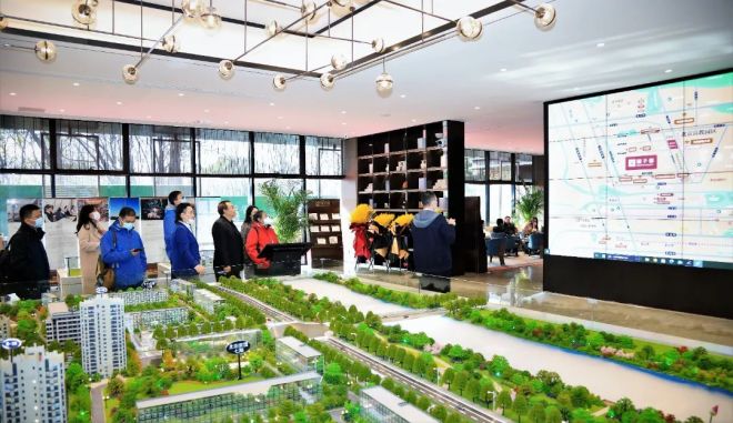 中國冶金報社報道組一行在國子郡銷售中心沙盤前調研采訪