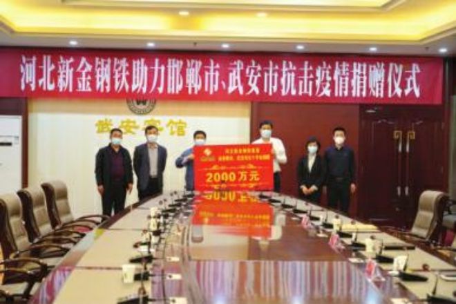 自2020年新冠肺炎疫情暴發以來,新金鋼鐵以“中國速度”為西安市公共衛生中心和湖北省鄂州市“雷神山醫院”2個項目的順利建設提供了鍍鋅鋼材保障。同時,新金鋼鐵累計捐款3500餘萬元,並集結黨員幹部發揮先鋒模範作用,募捐82餘萬元,援助邯鄲市、武安市紅十字會以及周邊鄉鎮做好疫情防控工作;捐資5100餘萬元改造道路,助力企業周邊環境提升和人居環境整治,增強人民群眾幸福感;為周邊村莊做好綠化規劃,購買樹苗,打造綠色鄉村。