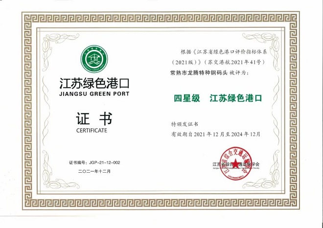 一位環保專家這樣說,龍騰特鋼通過建設分布式光伏項目,成功探索了一條“光伏+鋼鐵”的de碳tan中zhong和he路lu徑jing,為wei全quan麵mian推tui進jin企qi業ye低di碳tan轉zhuan型xing,為wei超chao低di排pai放fang提ti供gong了le值zhi得de學xue習xi和he可ke資zi借jie鑒jian的de經jing驗yan。去qu年nian底di,江jiang蘇su省sheng交jiao通tong運yun輸shu廳ting港gang航hang事shi業ye發fa展zhan中zhong心xin與yu省sheng綜zong合he交jiao通tong運yun輸shu學xue會hui港gang航hang分fen會hui聯lian合he發fa文wen公gong布bu了le2021年度江蘇省綠色港口評價結果,常熟市龍騰特種鋼碼頭被評為四星級綠色港口,成為常熟市首家綠色星級港口。