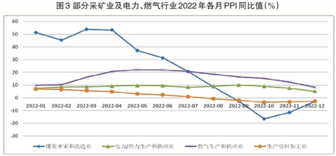 采礦業營業收入當月同比回落態勢明顯。2022年采礦業營業收入當月同比呈現逐月回落的態勢,如3月份營業收入當月同比增長47.53%,為全年最高值,9月份回落至3%,11月份營業收入轉為下降10.7%。這一現象與采礦業中煤炭開采和洗選業PPI當月同比走勢相關聯,自5月起煤炭開采和洗選業PPI當月同比呈現逐月回落態勢,如煤炭開采和洗選業3月份PPI當月同比增長53.9%;8月份回落至8.6%,回落了45.3個百分點;9月—12月份轉為同比負增長,分別同比下降2.67%、16.5%、11.5%、2.7%(見圖3)。鑒於煤炭開采和洗選業營業收入占采礦業營業收入比重在50%~60%之間波動,據此可判定2022年9月—12月份煤炭PPI當月同比大幅下降,導致煤炭開采和洗選業營業收入的下降,進而導致采礦業營業收入的下降。