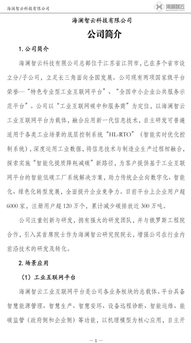 海瀾智雲於2015年在江蘇省江陰市注冊成立,係海瀾集團控股企業。海瀾智雲緊緊圍繞國家“雙碳”戰略,以“工業互聯網碳中和服務商”為定位,以海瀾智雲工業互聯網平台為載體,融合應用新一代信息技術,自主研發可普遍適用於各類工業場景的底層控製係統“HL-RTO”(智能實時優化控製係統),深度運用工業數據,將信息技術與製造業生產過程相融合,探索實施“智能化提質降耗減碳”新路徑,為客戶提供基於工業互聯網平台的智能低碳工廠係統解決方案,助力傳統企業向數字化、智能化、綠色化轉型發展,全麵提升企業競爭力。目前平台上企業用戶超6000 家,注冊用戶超 120 萬個,累計減少碳排放近300萬噸。