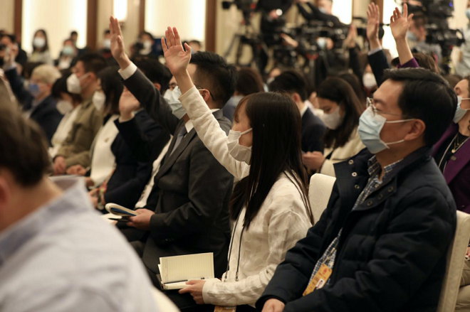 圖為《中國冶金報》記者(右二)在現場舉手提問。(楊登峰 攝)