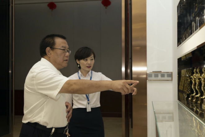 圖為陳玉千一行參觀森特股份展廳