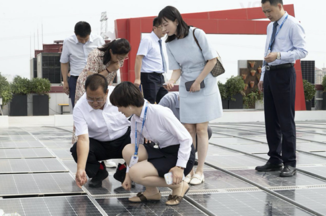 圖為陳玉千一行參觀森特股份B棟建築光伏一體化屋麵並合影留念