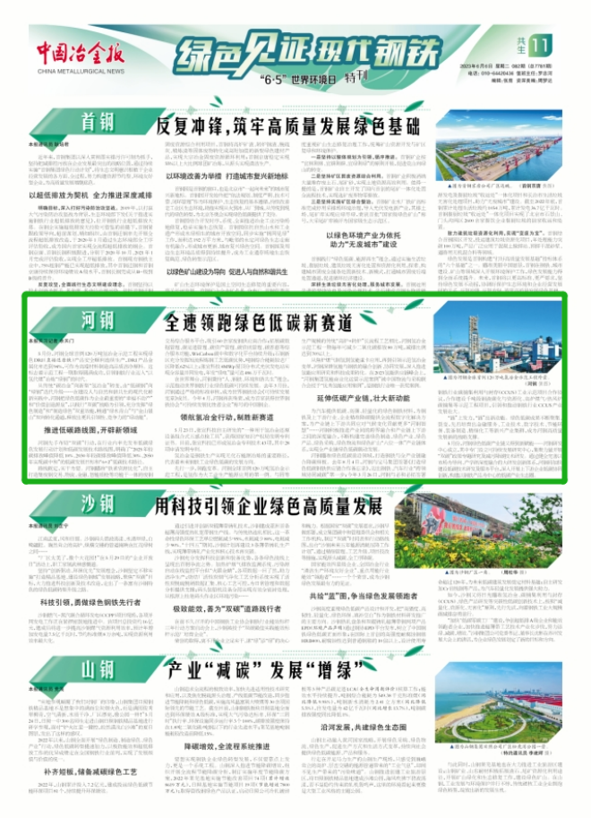 從傳統“碳冶金”向新型“氫冶金”轉變,由“低碳鋼”向“綠鋼”迭代升級……在建設人與自然和諧共生的現代化嶄新實踐中,河鋼把綠色低碳作為企業最重要的“幸福不動產”和“價值創造源泉”,以踐行“雙碳”戰略為引領,充分發揮“綠色製造”和“製造綠色”雙重效能,暢通“綠水青山”與“金山銀山”雙向轉化通道,釋放出更具引領性、競爭力的“綠動能”。