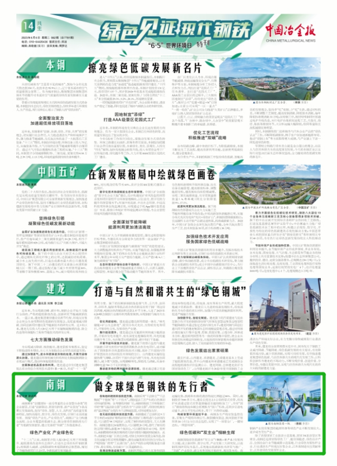 “十二五”以來,南鋼累計投入超120億元用於環保提升、超低排放改造和生態保護,打造生態綠色標杆鋼鐵強企;按照源頭減碳、過程降碳和末端固碳的總體思路,規劃了節能降碳項目共23項,爭做低碳發展領跑者。