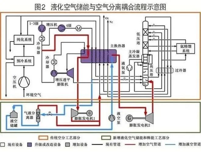 鋼gang鐵tie企qi業ye具ju備bei液ye化hua空kong氣qi儲chu能neng所suo需xu的de空kong分fen裝zhuang置zhi,通tong過guo液ye化hua空kong氣qi儲chu能neng與yu空kong分fen設she備bei有you機ji耦ou合he,可ke以yi最zui大da化hua節jie約yue設she備bei投tou資zi成cheng本ben,提ti高gao儲chu能neng經jing濟ji效xiao益yi。此ci外wai,鋼gang鐵tie企qi業ye有you大da量liang低di品pin位wei餘yu熱re,也ye可ke以yi與yu液ye化hua空kong氣qi儲chu能neng實shi現xian多duo能neng互hu補bu,提ti高gao儲chu能neng的de綜zong合he效xiao率lv。圖tu2為液化空氣儲能與空氣分離耦合流程示意圖。