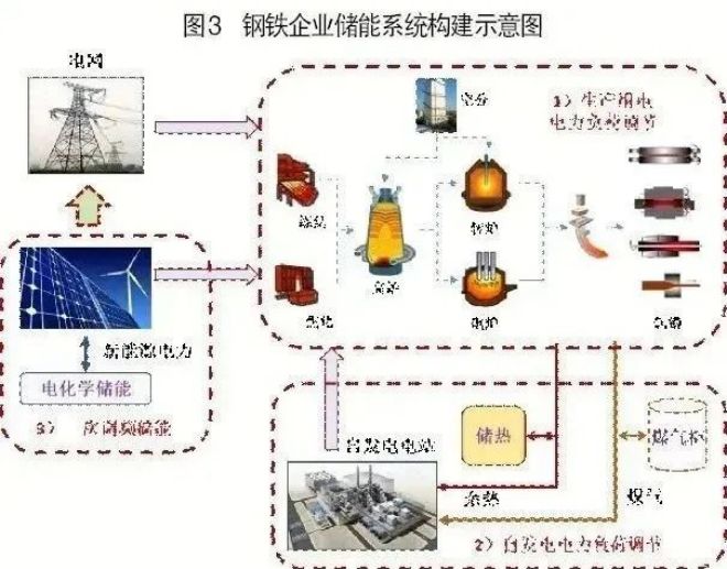 該(gai)企(qi)業(ye)將(jiang)儲(chu)能(neng)係(xi)統(tong)分(fen)布(bu)式(shi)植(zhi)入(ru)鋼(gang)鐵(tie)工(gong)藝(yi)流(liu)程(cheng)中(zhong),減(jian)少(shao)了(le)設(she)備(bei)投(tou)資(zi),增(zeng)大(da)了(le)儲(chu)能(neng)容(rong)量(liang),促(cu)進(jin)了(le)新(xin)能(neng)源(yuan)發(fa)電(dian)與(yu)鋼(gang)鐵(tie)的(de)進(jin)一(yi)步(bu)結(jie)合(he)。在(zai)儲(chu)能(neng)效(xiao)率(lv)85%、電網電價0.6元/千瓦時的情況下,該企業儲能係統年收益9000萬元,靜態投資回收期僅4.5年,經濟可行性良好。圖3為鋼鐵企業儲能係統構建示意圖。