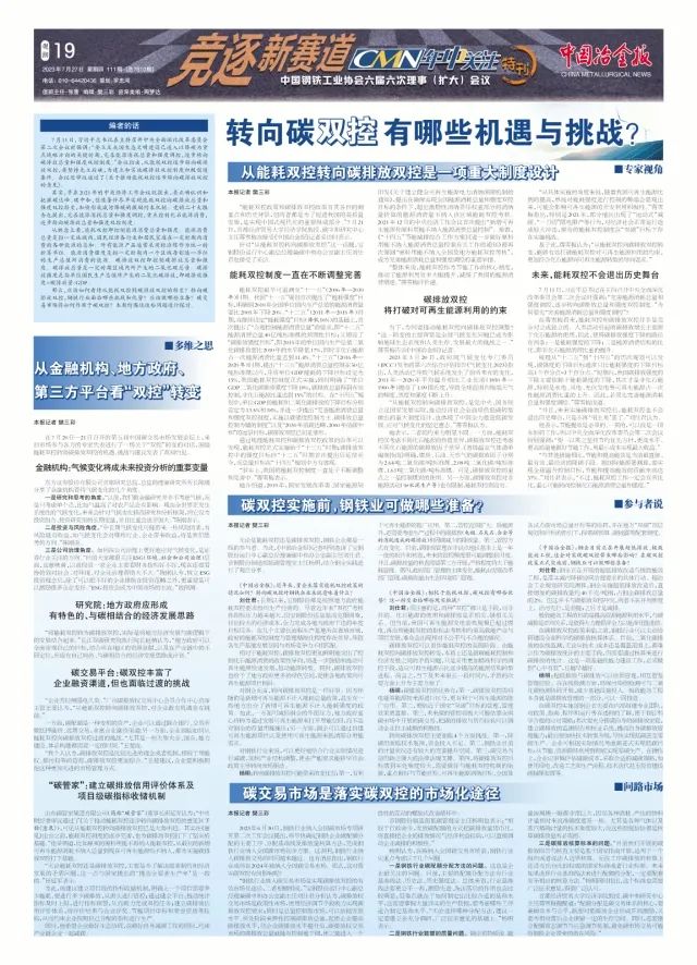 那na麼me,應ying該gai如ru何he看kan待dai從cong能neng耗hao雙shuang控kong到dao碳tan排pai放fang雙shuang控kong的de轉zhuan變bian?轉zhuan向xiang碳tan排pai放fang雙shuang控kong,鋼gang鐵tie行xing業ye麵mian臨lin哪na些xie挑tiao戰zhan和he優you勢shi?應ying該gai做zuo哪na些xie準zhun備bei?碳tan交jiao易yi市shi場chang將jiang如ru何he作zuo用yong於yu碳tan雙shuang控kong?本ben期qi特te圍wei繞rao這zhe些xie問wen題ti進jin行xing探tan討tao。