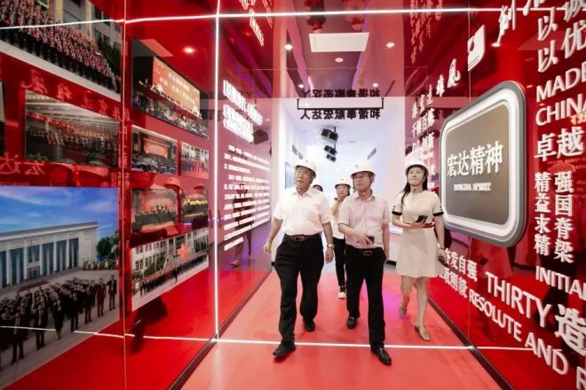 圖為陳玉千一行參觀宏達鋼鐵企業文化展示走廊