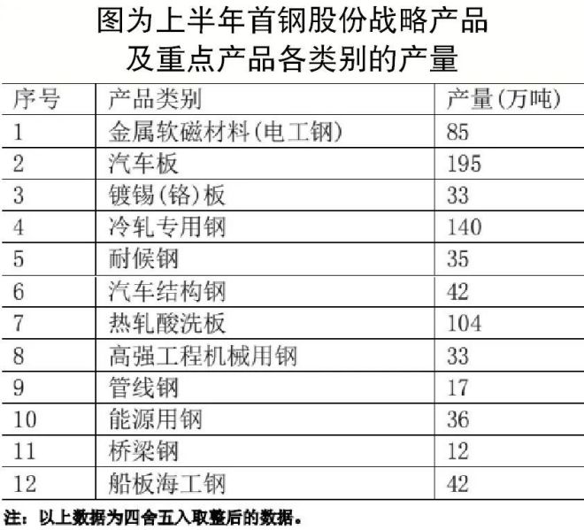 首鋼股份表示,上半年,公司堅持電工鋼持續引領、汽車板做精做強、鍍錫板高端突破的發展戰略,實現產品質量和效益雙提升。“上半年,三大戰略產品(電工鋼、汽車板、鍍錫(鉻)板)產量合計為313萬噸,占公司鋼材總產量的27%;九類重點產品(冷軋專用鋼、熱軋酸洗板、耐候鋼、能源用鋼、汽車結構鋼、高強工程機械用鋼、管線鋼、橋梁鋼、船板海工鋼)產量為461萬噸,占公司鋼材總產量的39%。”可見,首鋼股份戰略及重點產品占比已達66%,占據絕對比重。