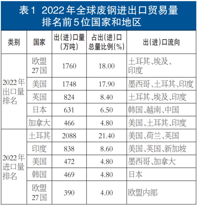 根據國際回收局數據,2021年全球廢鋼貿易量約1.1億噸,主要在亞洲、歐洲、北美等地區流通;2022年,受全球粗鋼產量下降影響,全球廢鋼貿易量降至9760萬噸,廢鋼出口量排前5位的國家和地區分別為歐盟27國、美國、英國、日本、加拿大,合計出口5430萬噸,約占全球廢鋼總出口量的56%;排前5位的廢鋼進口國家和地區分別為土耳其、印度、美國、韓國、歐盟27國,合計進口4260萬噸,約占全球廢鋼總進口量的44%(見表1)。