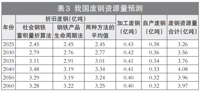 結合國內粗鋼產量預測結果,預計2030年中國廢鋼資源量約為3.6億噸,2035年近4億噸,2040年達到階段性峰值水平4.1億噸左右,2060年回落至4億噸左右(見表3)。