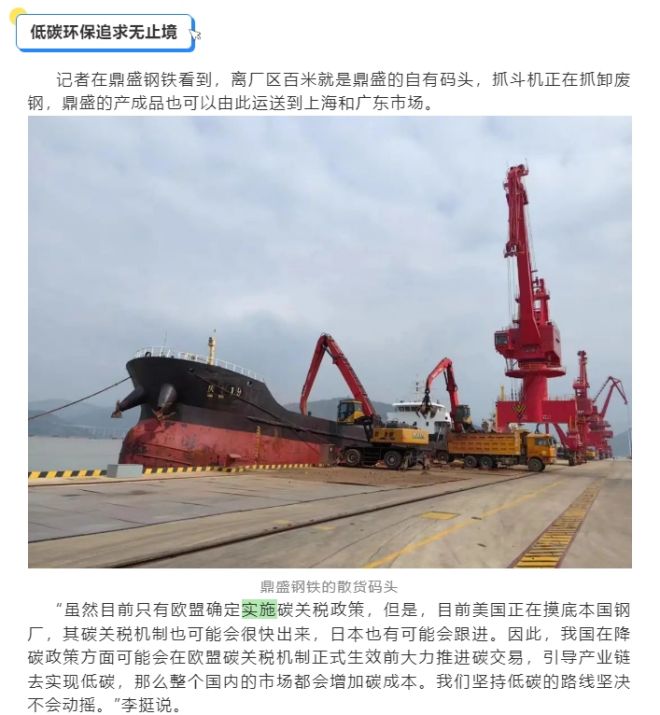 鼎盛下遊很多用戶的生產基地在中國,但是產成品很多出口國外。“歐洲的鋼鐵用戶,目前在全球範圍內尋找低碳綠鋼, 由於歐盟的碳關稅機製,很多客戶願意支付綠色低碳的溢價。”李挺說。