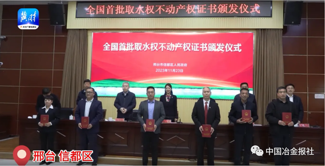 11月23日,全國首批取水權不動產權證書頒發儀式舉行。邢台德龍獲得全國首批取水權不動產權證書,取水權的確權登記,可以明晰產權,保障取用水戶對水資源使用、收益的權利。