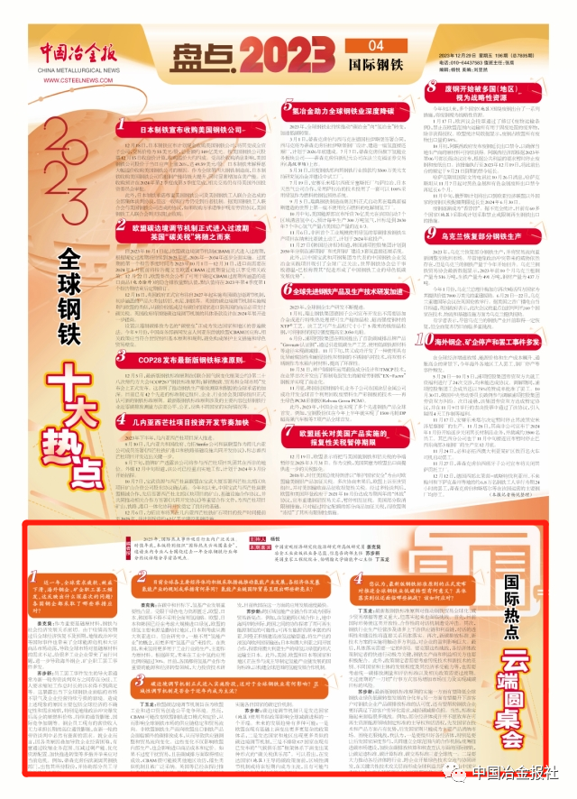 2023年,國際熱點事件吸引行業內廣泛關注。時值年底,本版特別組織“國際熱點雲端圓桌會”,邀請業內專業人士圍繞過去一年全球鋼鐵行業部分熱議話題分享前沿觀點。