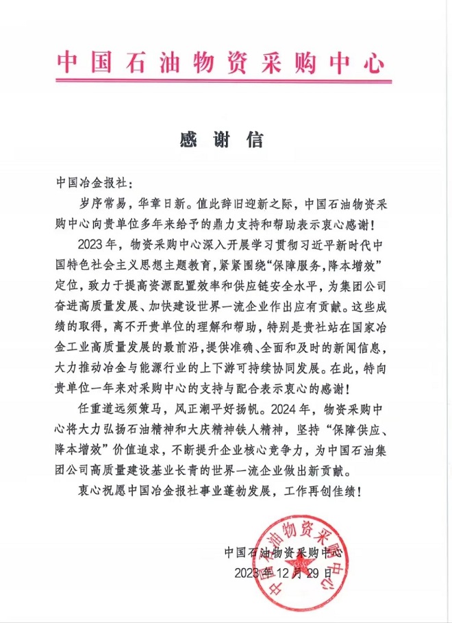 中國石油物資采購中心向中國冶金報社發來感謝信