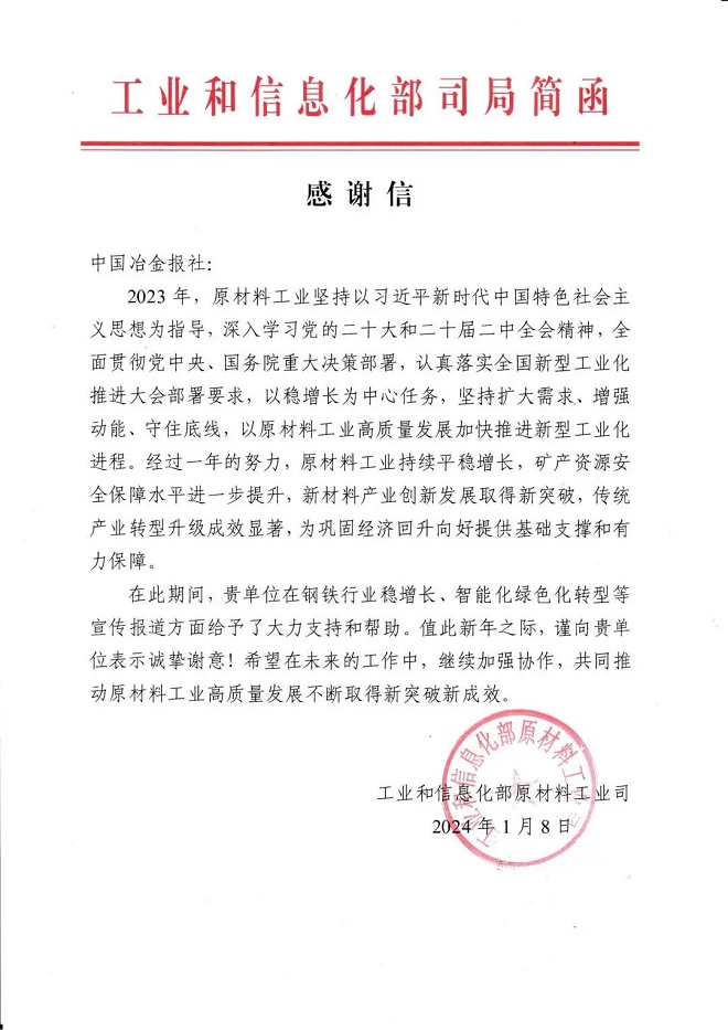 1月8日,工業和信息化部原材料工業司向中國冶金報社發來感謝信,感謝報社在鋼鐵行業穩增長、智zhi能neng化hua綠lv色se化hua轉zhuan型xing等deng宣xuan傳chuan報bao道dao方fang麵mian給gei予yu了le大da力li支zhi持chi和he幫bang助zhu。希xi望wang在zai未wei來lai的de工gong作zuo中zhong,繼ji續xu加jia強qiang協xie作zuo,共gong同tong推tui動dong原yuan材cai料liao工gong業ye高gao質zhi量liang發fa展zhan不bu斷duan取qu得de新xin突tu破po新xin成cheng效xiao。