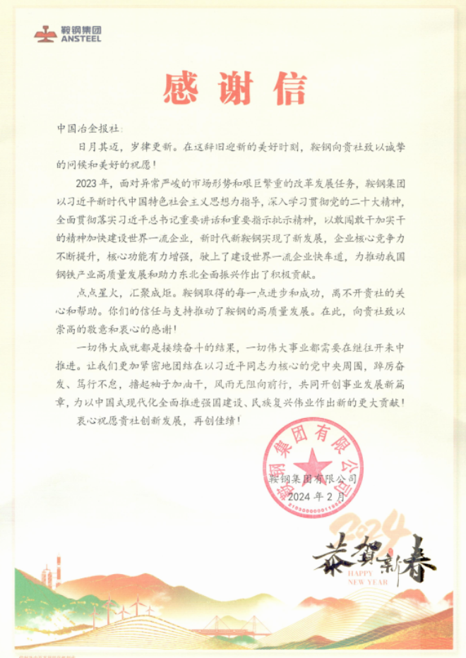 工信部工業文化發展中心、鞍鋼集團、包鋼集團向中國冶金報社發來感謝信