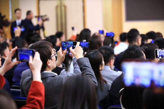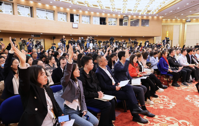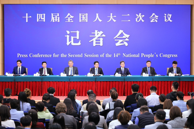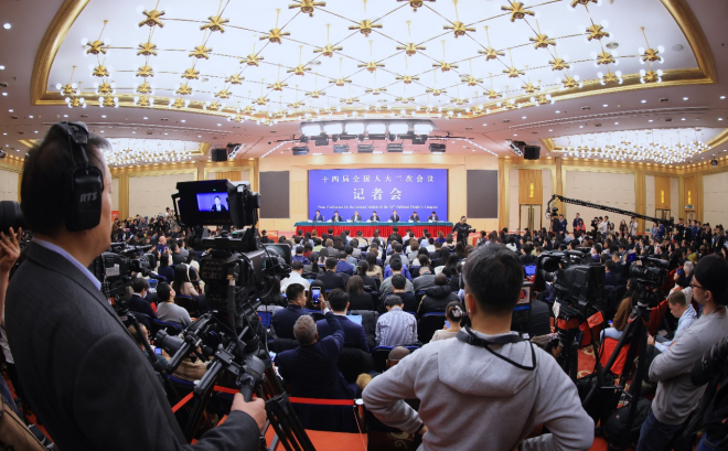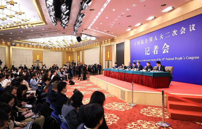 3月6日,十四屆全國人大二次會議在北京梅地亞中心新聞發布廳舉行記者會。國家發展和改革委員會主任鄭柵潔、財政部部長藍佛安、商務部部長王文濤、中國人民銀行行長潘功勝、中國證券監督管理委員會主席吳清就發展改革、財政預算、商務、金融證券等相關問題回答中外記者提問