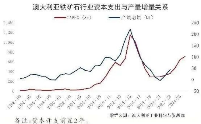 鐵(tie)礦(kuang)石(shi)供(gong)給(gei)端(duan)即(ji)將(jiang)進(jin)入(ru)繁(fan)榮(rong)期(qi)。上(shang)圖(tu)是(shi)根(gen)據(ju)澳(ao)大(da)利(li)亞(ya)工(gong)業(ye)科(ke)學(xue)資(zi)源(yuan)部(bu)相(xiang)關(guan)數(shu)據(ju)整(zheng)理(li)的(de)鐵(tie)礦(kuang)石(shi)行(xing)業(ye)資(zi)本(ben)開(kai)支(zhi)與(yu)鐵(tie)礦(kuang)石(shi)產(chan)量(liang)增(zeng)量(liang)變(bian)化(hua)相(xiang)關(guan)性(xing)圖(tu)(1990年—2023年)。可以看到,資本開支平均領先鐵礦石產量增量2.5年。在經曆了2016年—2019年的低速增長後,2020年開始,相關的資本開支重新進入到擴張階段,按照2年~3年的領先性,未來鐵礦石產量的釋放不可避免。該部門甚至預計,到2029年,澳大利亞的鐵礦石出口量預計將達到9.83億噸。