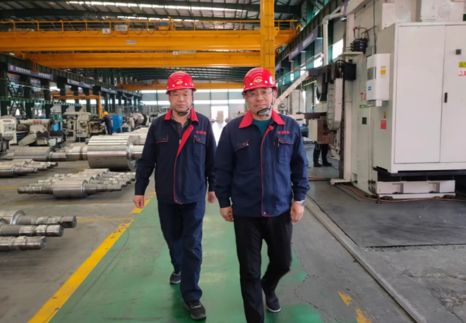 朝陽聯強軋輥有限公司總經理孫建勳(右)在車間視察