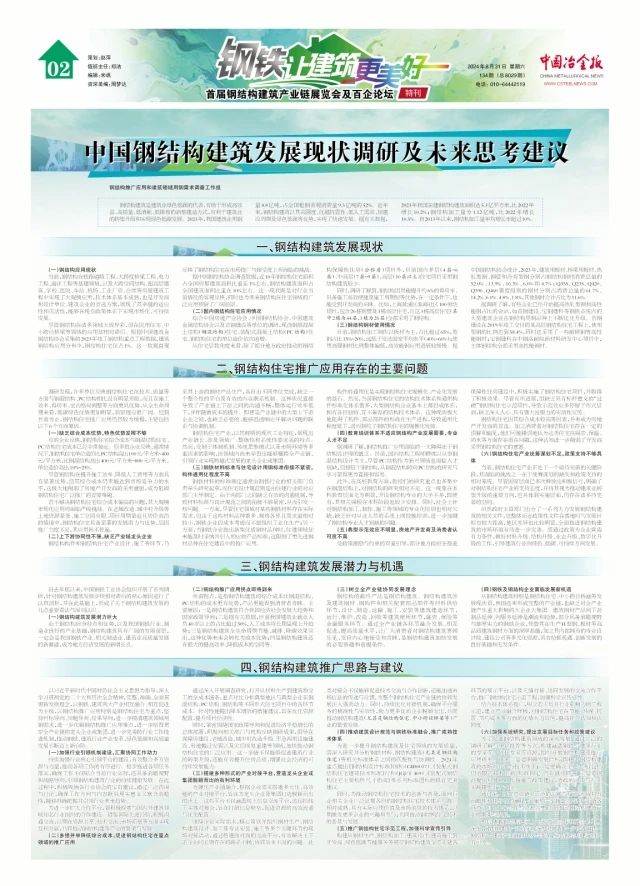 從鋼結構建築特別是鋼結構住宅、zhongxiaokuajingqiaohandengfazhanxianzhuangkan,woguohaiweixingchengwanzhengdechanyelian,yequefaduiquanchanyelianchanshengzhongdayingxiangdedaqiyedajituan。jianzhugangcaichanpinxiangxiayouzhipinyanshen、向服務延伸是潮流和趨勢,部分具備前瞻視野與雄厚實力的鋼鐵企業,憑借其在生產H型鋼、板材等高品質建築鋼材方麵的深厚基礎,加之其內部擁有的專業設計院、建設公司等多元化資源,具有搶抓機遇、創新發展的良好基礎和先發條件。