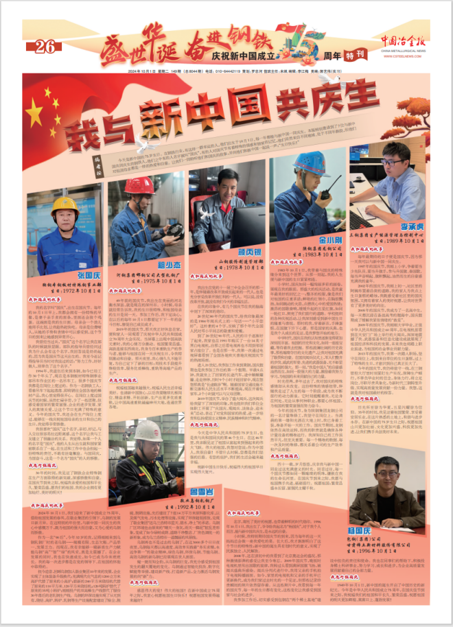 今天是新中國的75歲生日。在鋼鐵行業,有這樣一群幸運的人,他們出生於10月1日,每一年都能與新中國一同慶生。本版特別邀請到了7位與新中國共同慶生的鋼鐵人,他們之中有的人名字就叫“國慶”,有的人對國慶節有著特殊的情感和獨家的記憶,他們雖然來自不同地域、處於不同年齡段,但他們對祖國母親都是一樣的熱愛和自豪。讓我們一同聆聽他們和國慶的故事,並向他們和新中國一起說一聲:“生日快樂!”