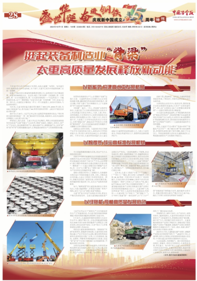 矢誌造重器,為國增底氣。踐行國家製造業高端化、智能化、綠色化發展要求,太重使命光榮、責任重大。如今的“國之太重”,正以昂揚奮鬥的姿態闊步向前,在建設製造強國、推進中國式現代化的宏偉篇章中譜寫新的輝煌,以堅定信心贏得優勢、贏得主動、贏得未來!