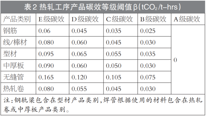該標準考慮熱軋產品結構的多樣性,熱軋產品碳效等級閾值采用粗鋼產品碳效等級閾值+熱軋工序產品碳效等級閾值(β)的評價方法(表2)。