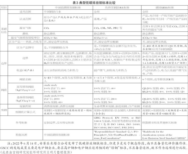 本文選取國外兩個有代表性的標準與鋼協標準進行比較(表3),分別是負責任鋼鐵組織的RS標準與德國鋼協的LESS標準,其中,RS標準是指《Responsible steel International Production Standard》2.1版,這是在2022年9月14日發布的《Responsible steel International Standard》2.0版基礎上,經1年左右試驗運行與公開征求意見後修訂完善並更名的最新版本。LESS標準是指2024年4月底德國鋼鐵工業協會(WV Stahl)和聯邦經濟事務和氣候保護部(BMWK)聯合發布的低碳鋼鐵標準。
