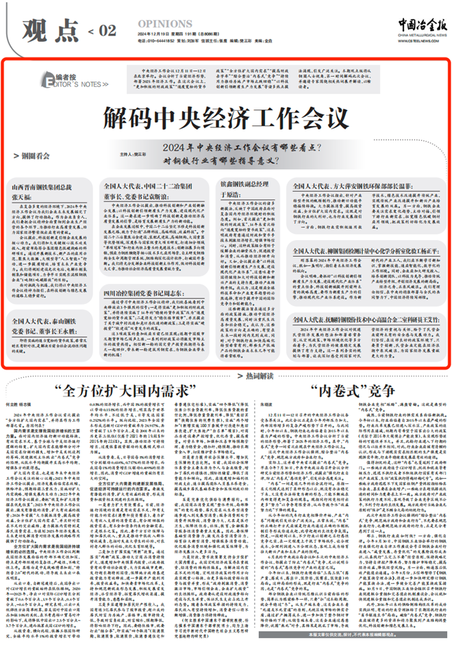 中央經濟工作會議12月11日—12日在北京舉行。會議分析了當前經濟形勢,部署2025年經濟工作。在這次會議上,“更加積極的財政政策”“適度寬鬆的貨幣政策”“全方位擴大國內需求”“提高財政赤字率”“綜合整治‘內卷式’競爭”“持續用力推動房地產市場止跌回穩”“以科技創新引領新質生產力發展”等諸多熱點提法湧現,引發廣泛關注。《中國冶金報》將從鋼圈人士視角,第一時間解碼此次會議,並邀請專家圍繞相關熱詞展開解讀,以饗讀者。