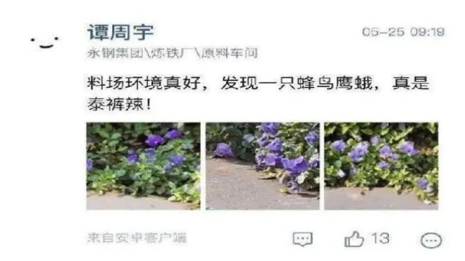 近年來,為進一步提升全員環保意識,永鋼在現場汙染源治理、項目建設過程中同步推進“園林工廠”風貌提升,倡導全員改善,按照“河道變濕地、車間變花園、廠區變景區”的思路,努力打造“春有花、夏有蔭、秋有果、冬有景”的“碧波塔影,田園鋼城”。累計建綠、增綠290.28萬m2,廠區綠化覆蓋率達37.7%,固碳4354噸/年。如今,企業綠樹環繞,周圍的環境也越來越生態化,喜鵲、斑鳩、白鷺等野生鳥類也來這裏安家落戶。前段時間,原料場員工在廠區綠化中發現了一隻蜂鳥,發在同事圈引起熱議。