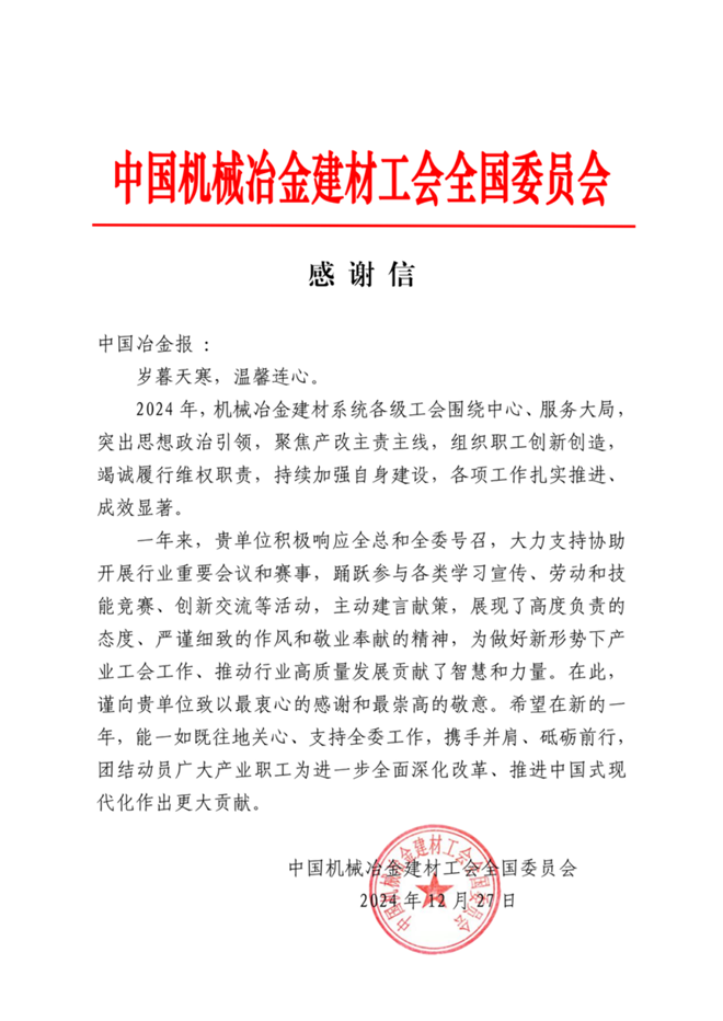 中國機械冶金建材工會全國委員會向中國冶金報社發來感謝信