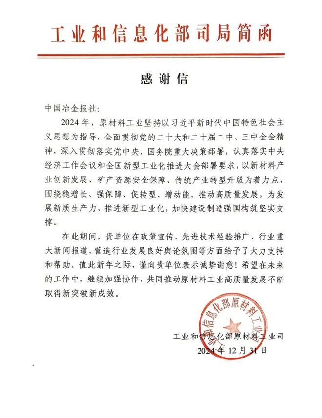2024年12月31日,工業和信息化部原材料工業司向中國冶金報社發來感謝信,感謝報社在政策宣傳、先進技術經驗推廣、行業重大新聞報道、營ying造zao行xing業ye發fa展zhan良liang好hao輿yu論lun氛fen圍wei等deng方fang麵mian給gei予yu的de大da力li支zhi持chi和he幫bang助zhu,並bing希xi望wang雙shuang方fang在zai未wei來lai的de工gong作zuo中zhong,繼ji續xu加jia強qiang協xie作zuo,共gong同tong推tui動dong原yuan材cai料liao工gong業ye高gao質zhi量liang發fa展zhan不bu斷duan取qu得de新xin突tu破po、新成效。